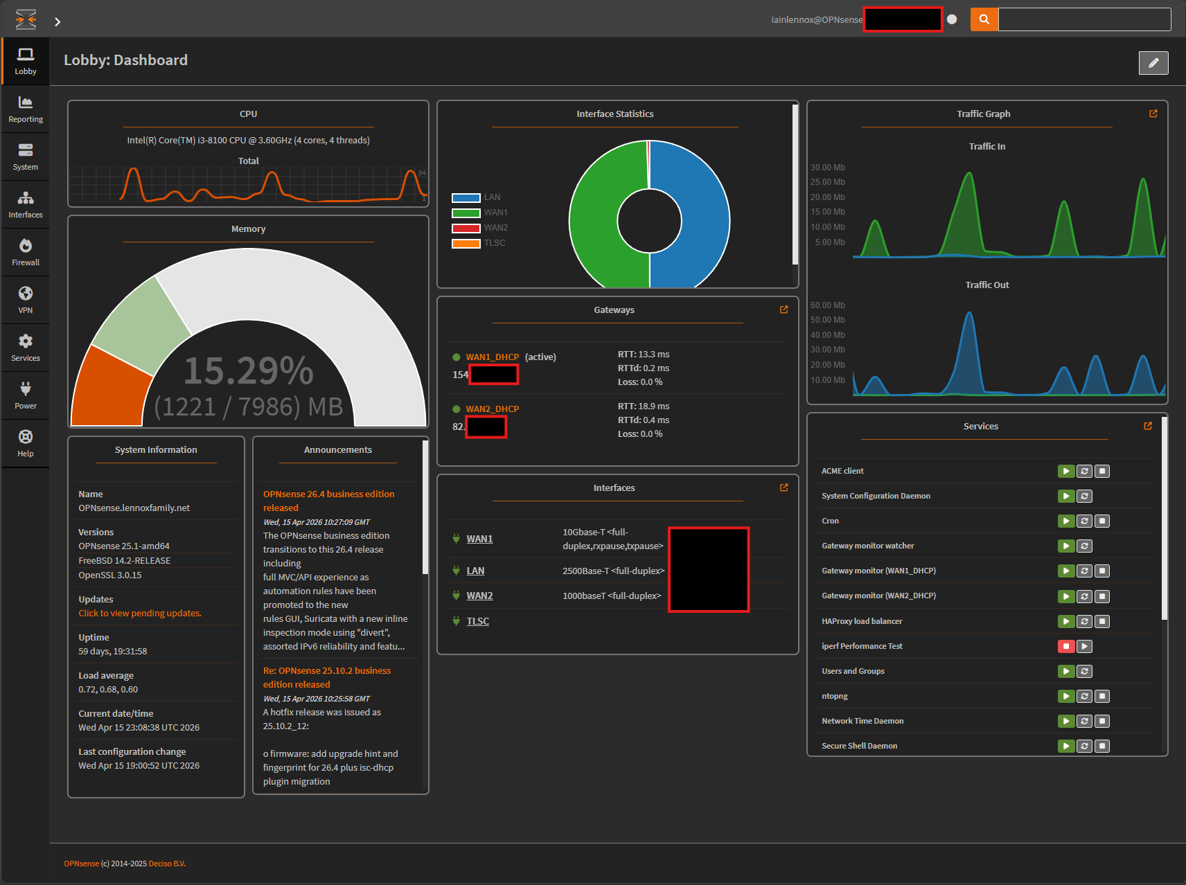 - An open-source firewall and router operating system. Instead of using a consumer router provided by your ISP or bought off the shelf, you run OPNsense on a small PC or dedicated appliance. It gives much finer control over routing, firewall rules, VLANs, and failover - at the cost of some complexity in setup.